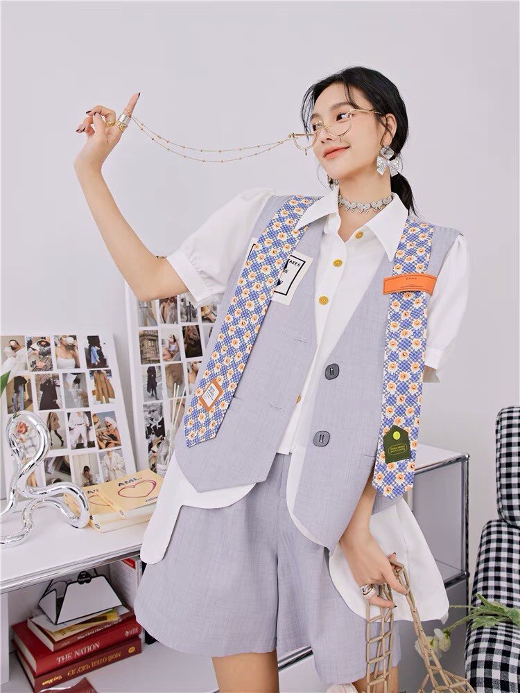 2021夏季复古英伦风领带西装马甲女法式高腰设计阔腿短裤两件套装热门设计联盟服务商