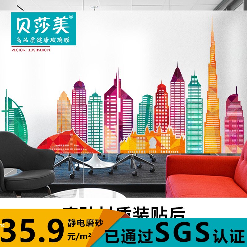 玻璃膜定制办公室隔断装饰膜创意膜现代城市建筑图案彩色磨砂贴膜热门设计联盟服务商